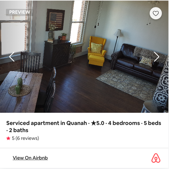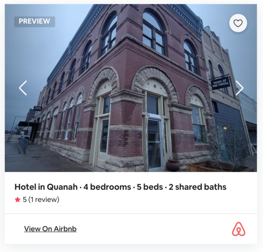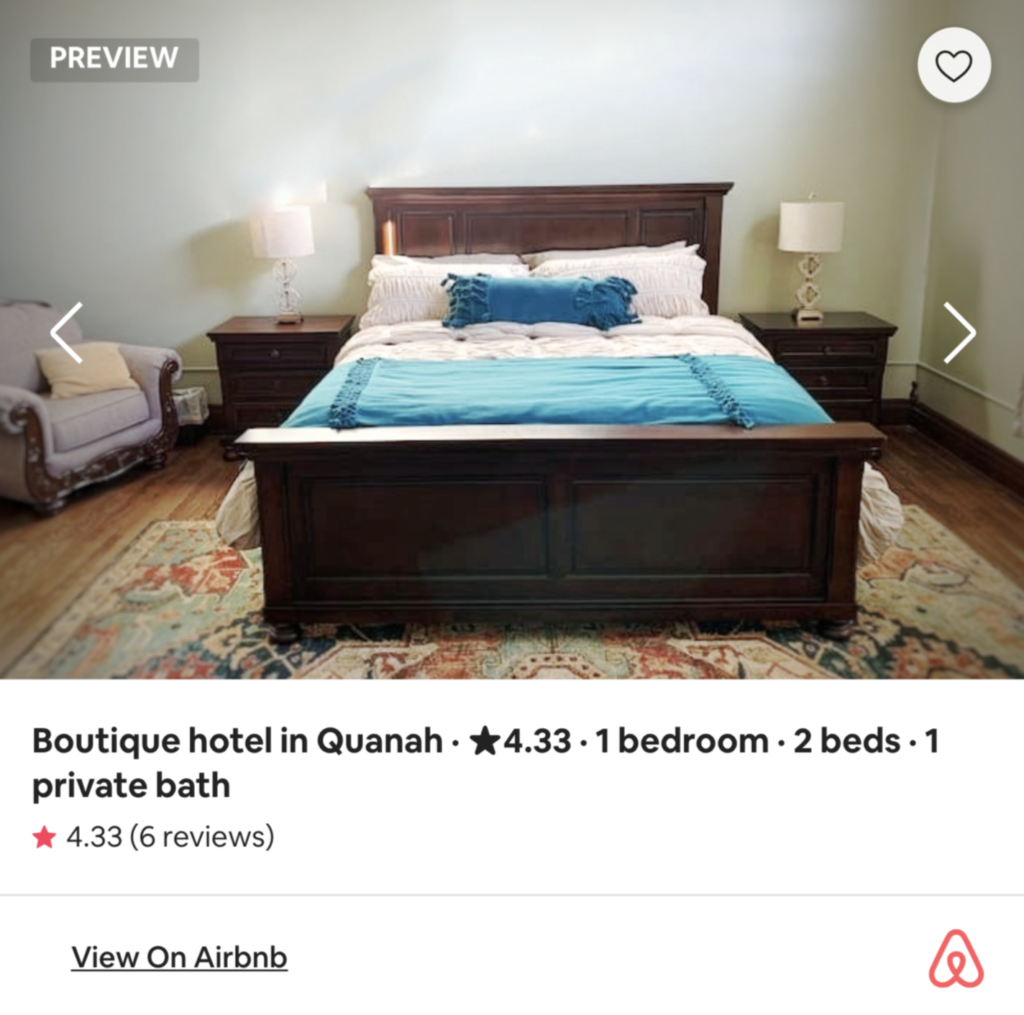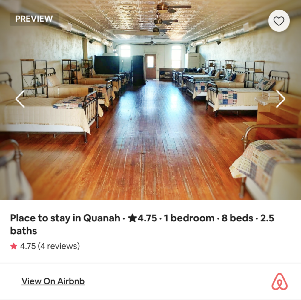 Located on Main Street in Quanah, Texas in a historic restored building. This lodge is the perfect bunkhouse to accommodate hunters, large groups, sleep-overs or family gatherings. Three stories give guests plenty of space to relax, cook, and hang out. It’s the perfect “summer camp” vibe full of amenities. Book your stay on AirBNB today.